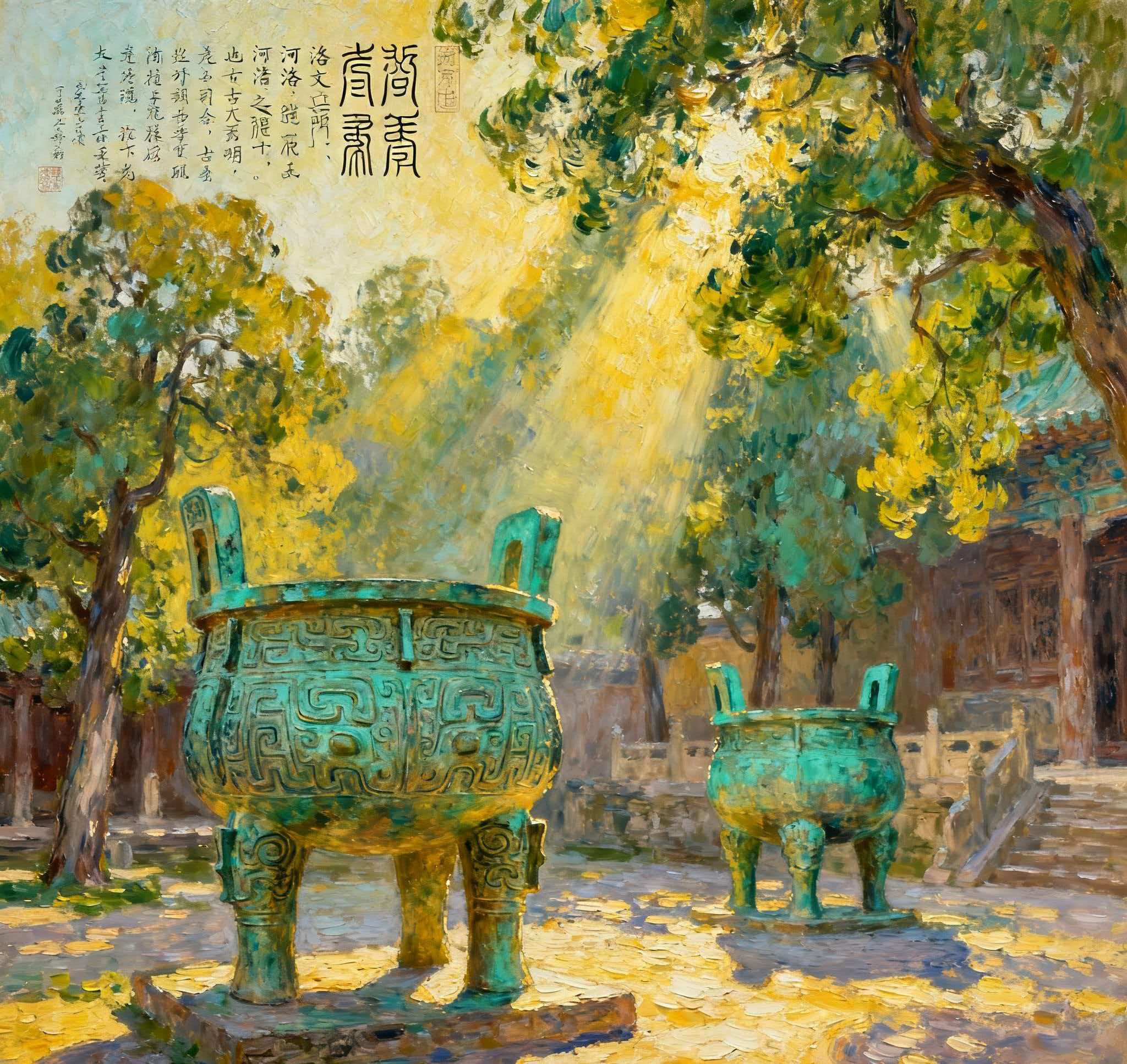 到了周代,河洛的故事里多了礼乐的声息。周公旦在洛水之滨营建成周城,把“礼”刻进了每一块城砖:朝堂上君臣的站位、祭祀时鼎簋的数量、宴饮时钟鼓的节奏,都有了严格的规制。如今在洛阳博物馆的“周礼展厅”,还能看见一套青铜编钟,钟体上的铭文记载着周王赏赐大臣的往事,轻轻敲一下,钟声清越绵长,能穿透千年的时光,让人想起《诗经》里“周虽旧邦,其命维新”的句子。那时候的河洛,不仅是政治的中心,更是文脉的“圆心”,孔子带着弟子来此“入周问礼”,在太庙的柱下看着青铜礼器,感叹“吾从周”——从此,“礼”成了华夏文明的脊梁,从河洛出发,顺着黄河洛水,流进了每一个中国人的骨子里。