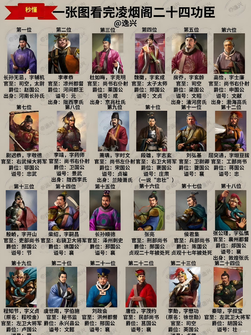 凌烟阁二十四功臣的评选,以“开国功勋、治国贡献、忠诚担当”为核心标准,涵盖了李世民创业与治世的各个阶段,构成极为多元。他们中既有自幼追随的故友亲信,也有敌对阵营归顺的贤才;既有决胜千里的武将,也有安邦定国的文臣;既有关陇贵族的代表,也有寒门出身的精英,完美诠释了贞观朝“惟贤是与”的用人理念。