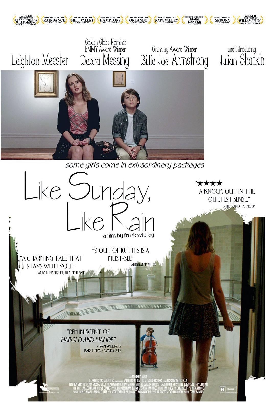 影片的结尾,埃莲诺离开雷吉,重新追寻音乐梦想,两人在车站告别,没有撕心裂肺的挽留,只有一个拥抱与一句“保持联系”。这段短暂的相伴,像一场恰到好处的雨,滋润了彼此干涸的内心,然后各自走向人生的下一程。就像影片的标题“如晴天,似雨天”——生活有晴有雨,而那些偶然遇见的温暖,会成为支撑我们走过风雨的力量。