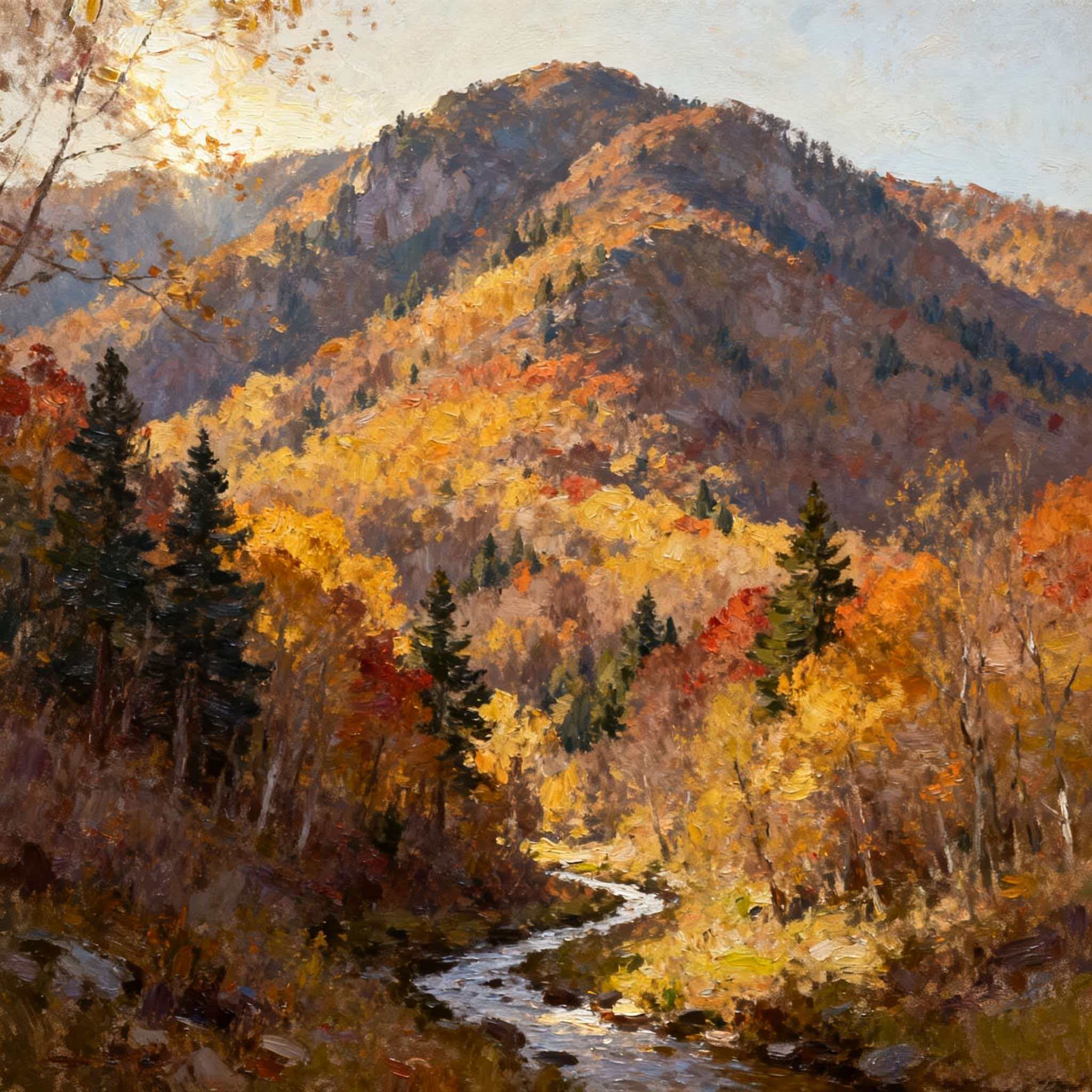 山坳里藏着条溪沟,绕着石阶弯弯曲曲地走。水比夏天浅了许多,露出大半的卵石,卵石上裹着层薄霜,阳光照下来,霜就慢慢化了,变成小水珠顺着石缝渗下去,留下浅浅的湿痕。溪水“叮咚”响,清得能看见溪底的小杂鱼,银闪闪的,顺着水流游,一碰到人影就“嗖”地钻到石缝里,只留个尾巴尖在外面晃。偶有几片枫叶飘进溪里,有的被卵石挡住,停一会儿又被水流推着走,叶面上的水珠像碎钻,还有几只小虾米趴在枫叶下面,爪子扒着叶脉,像搭着免费的船往下游去。溪边的石凳是青石板做的,凳角沾着点干枯的茅草,旁边还丢着个铜烟袋锅,有点氧化的绿锈,袋锅里还留着点烟末,闻着有淡淡的焦香——该是前几日樵夫歇脚时落下的。
